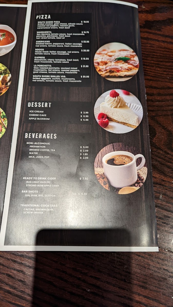 The pizza offerings are equally tempting, featuring the exceptional South Shore Pizza topped with grilled chicken, goat cheese, and roasted veggies, or the classic Margherita that's both refreshing and satisfying. Don’t forget to indulge your sweet tooth with the decadent New York Cheesecake or warm Apple Blossom.